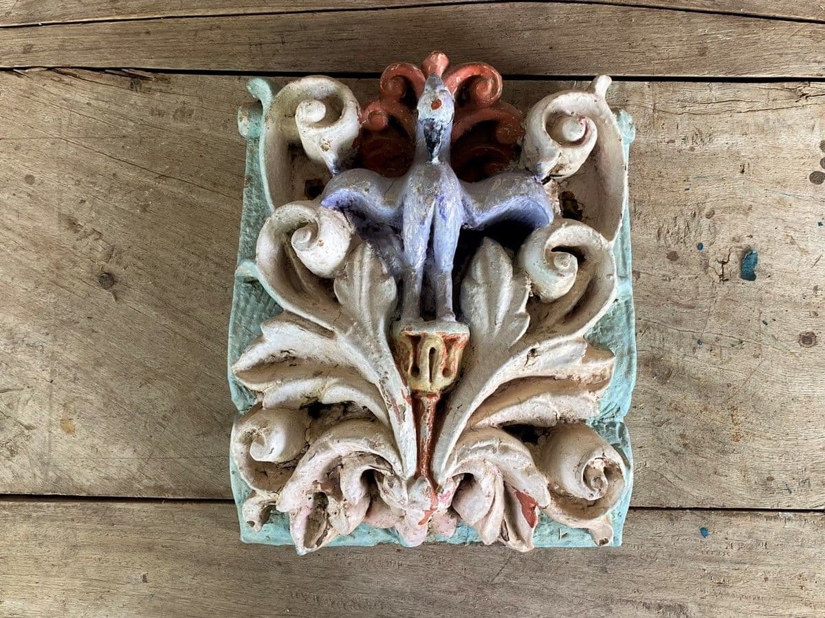19th century architectural polychrome carving of a peacock