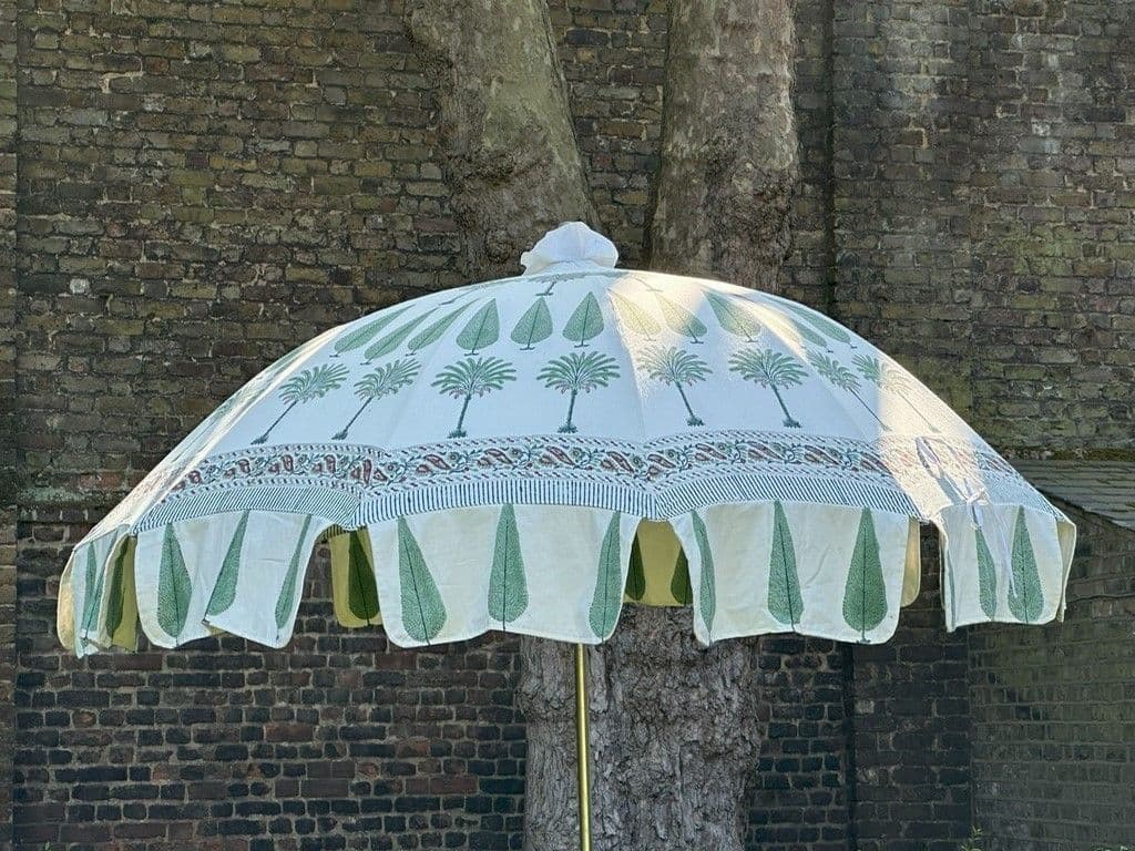 Our hand block print parasols come in beautiful Palm Tree or Floral designs. The block printing decorates the outside and the under side of the parasol, creating the atmosphere of sitting in a Maharaja’s Indian tent whilst you sip your morning coffee in the City or dine alfresco in the English countryside. The parasols have a diameter of 180cms or 6 feet.