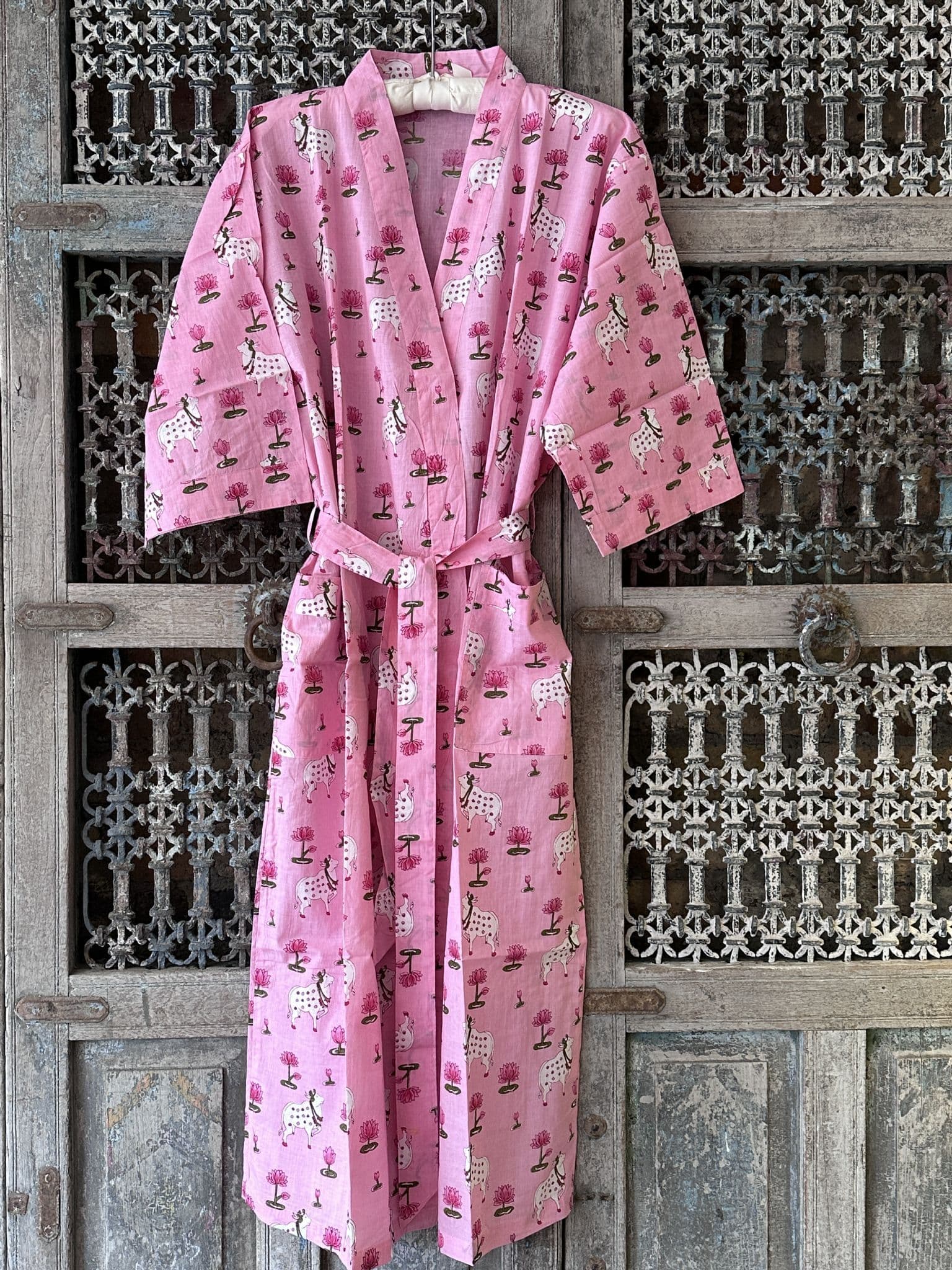 Kimono Block Print Cotton Robe in Pink with Lotus & Nandi Cow Design Colbalt Blue (1)