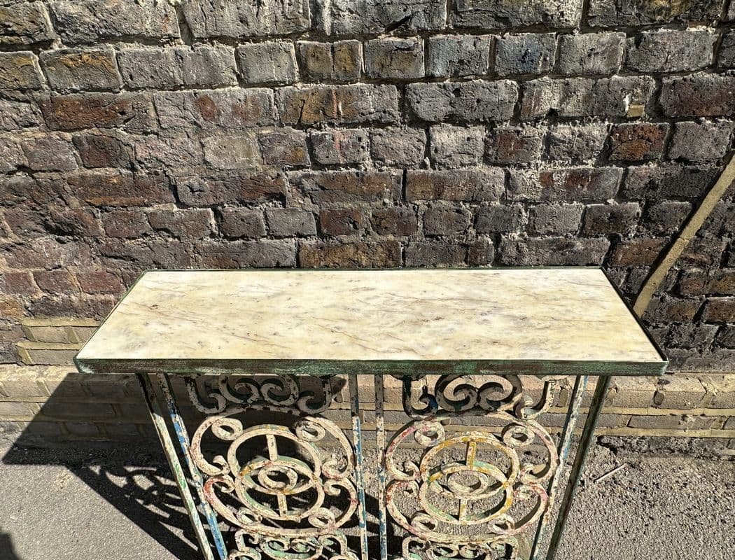 vintage iron console with faded paint tones and inset marble top